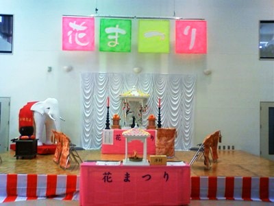 中央には御釈迦様の「誕生仏」を安置して、柄杓で像に甘茶をかけて祝います。