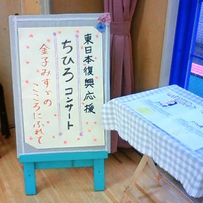 私はこの春から、ホール運営に関わる職場に異動になり、多くのミュージシャンが、震災から1年以上経った今も「東日本復興チャリティ」を標榜して、実は裏でホール使用料を減免で浮かせている、というような話を耳にすると、違う意味で悲しく心が痛む思いでした。そんな中にあって、ちひろさんの地道な取組みを拝見しておりますと、心が洗われるような気がいたします。これからもさらに頑張って!東日本にも「金子みすゞ@ちひろ」が根付きますようにお祈りしております。