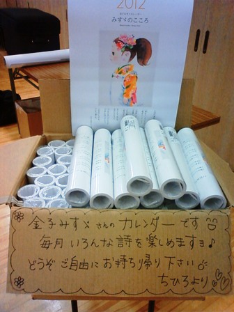 復興応援コンサート会場ではこのようにカレンダーを設置。段ボールだけど手書きのポップもどきでなんとか様になってるかな?嬉しいことにカレンダー大好評です!