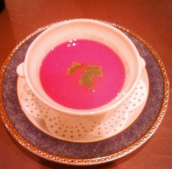 そして、夕食はホテルニュータナカの1階のレストランでご馳走になったのですが、そのコース料理のメニューの冷製スープがとても珍しかったのでご紹介。