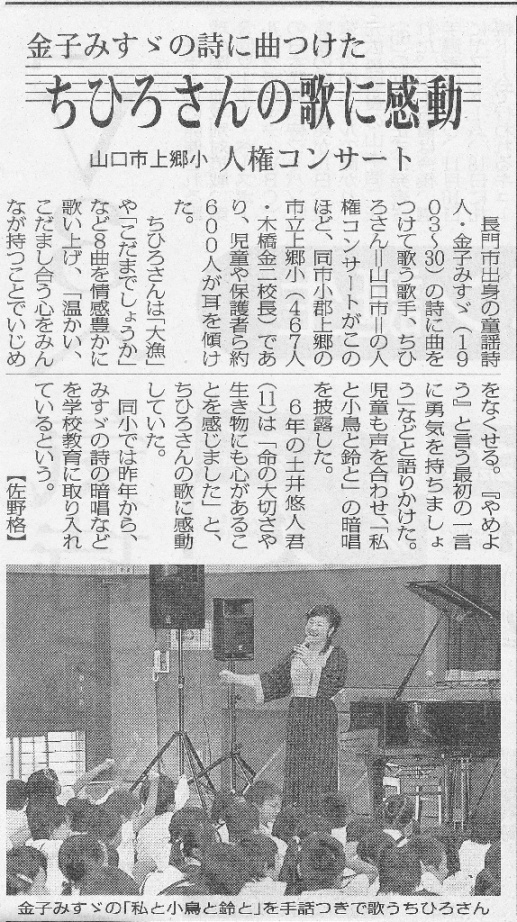 昨日の毎日新聞(山口版)に、山口市立上郷小学校のコンサートの記事を掲載してくださいました。