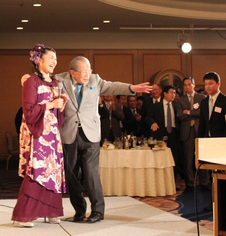 日野原先生が肩に手を回されて嬉しそうなリアクション!まわりの皆様も笑顔!ちひろさんの魅力が満開!