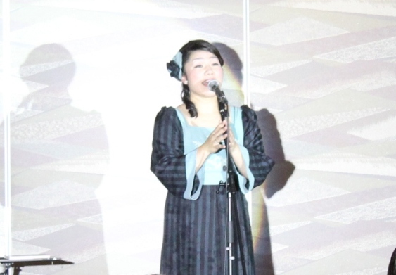 今日の衣装は、金子みすゞさんが20歳の時に撮られた写真で、着ておられる着物と同じ柄に染めてもらった着物生地で作った衣装です♪水色の部分は、私の母の着物の帯の生地。