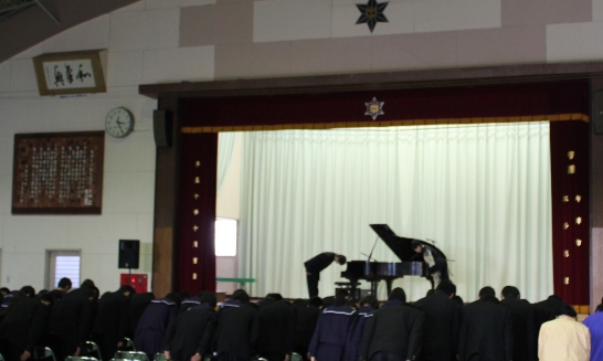 生徒代表お礼の挨拶。生徒会長にあわせ、全校生徒の皆さんも深いお礼。この姿には、感動しました。