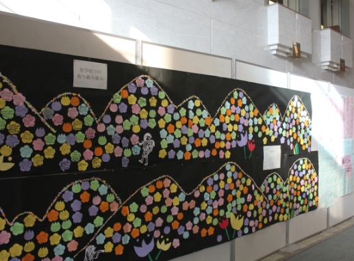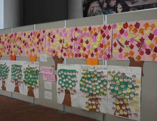 ホールロビーには、各小学校中学校の試みの作品が展示されていました。お互いの良いところを書き合っている、ほのぼのする作品です。