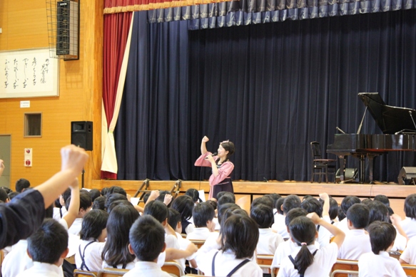 終演後、児童の皆さんが退場して私は保護者の方々対象にCD販売サイン会をさせていただいた後、校舎の廊下を控え室へ向かって歩いていたら、教室から「有難うございました~!」と一斉に声をかけてくれたクラスが♪「ありがとう~!」とこちらも手を振って答えました。嬉しかったです♪