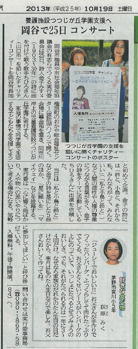 それは、岡谷市内にある児童養護施設つつじが丘学園の支援のチャリティコンサート。この企画は、以前岡谷市でコンサートでお世話になった主催者のメンバーの方々が、市民の方々にも呼びかけてくださったものです。とても嬉しいことです。