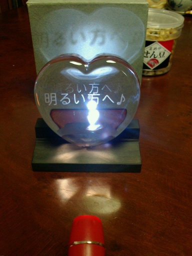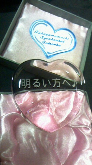 ガラスのハートを、チームKとして贈らさせて頂きましたが、この品物は福島県の郡山コミュニティ放送KOCOラジさんの中で放送しております、ショコラジ(郡山地区商工会の若手後継者育成事業の一貫として、郡山12地区 各地の情報をお届けしてる番組)で、富久山町の青年部の皆さんからのリスナープレゼントでして、大切な方へメッセージを彫刻して頂ける!と聞き、ちひろさんへ贈りたい気持ちを添えて応募致しましたところ、見事当選!